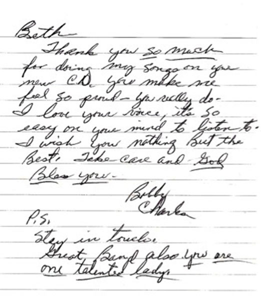 A Letter From Bobby to Beth McKee thanking Beth For Recording an Album of His Songs